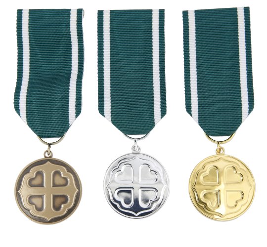Pronssista ja hopeista ansiomitalia voi hakea ilman aikarajaa. Kuvassa vas. pronssinen, hopeinen ja kultainen Pro diaconia ansiomitali. Lue lisää tästä linkistä.